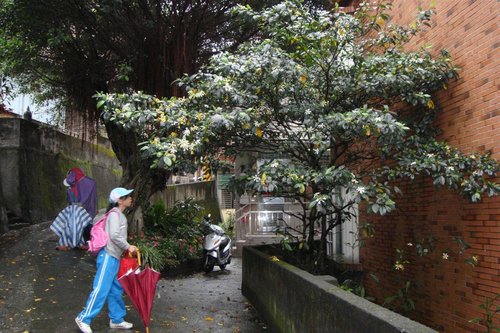 撐起雨傘帶芊芊走捷徑去上課